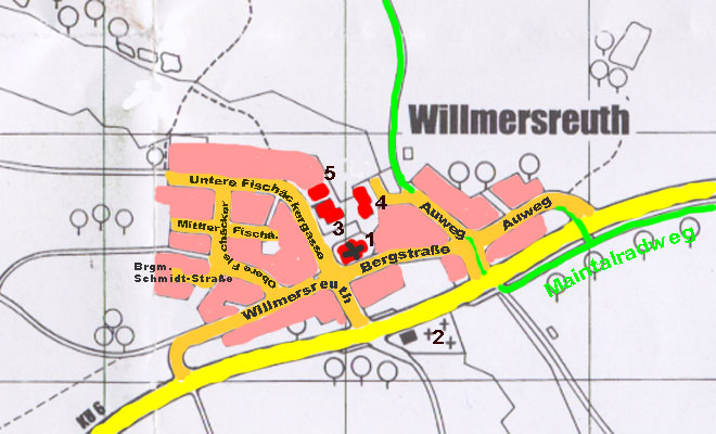 3 Gasthof "Zur Linde" 4 Waldhotel 5 Gemeindestuben mit Feuerwehrhaus